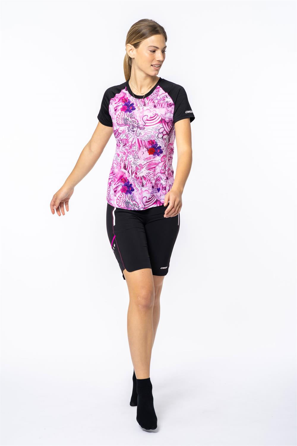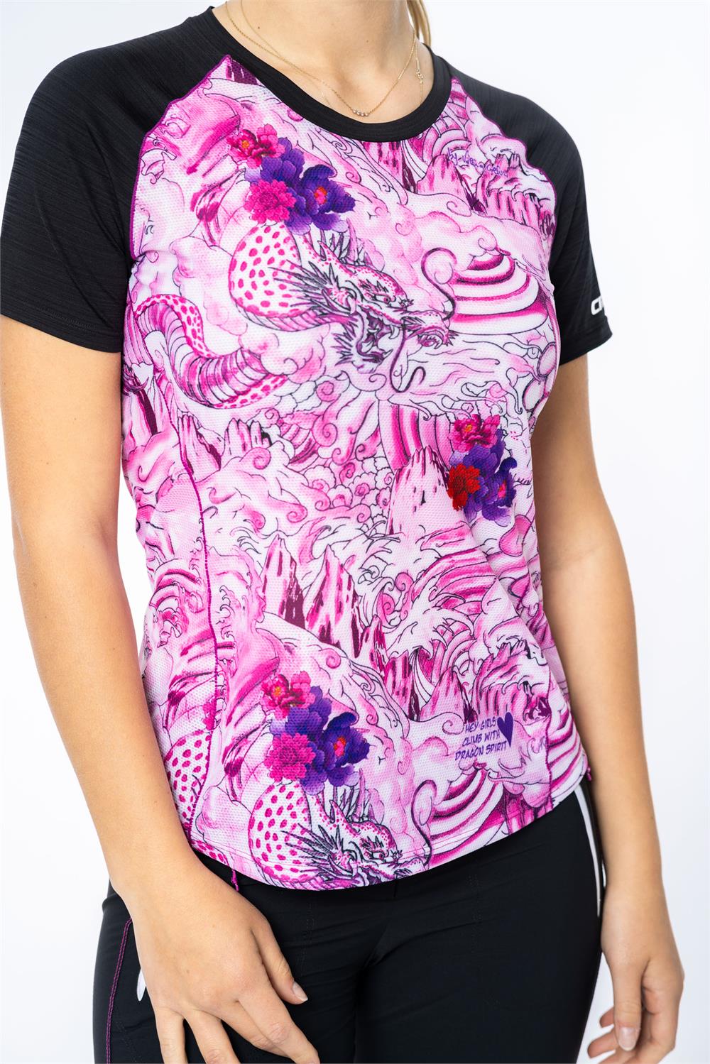 The printed panels are produced using a polyester with a discontinuous honeycomb texture, while the sleeves are made of lightweight, cool, and quick-drying Coolwave microfiber with a stripe pattern. The neckline trim is soft and light, suitable for more technical use.