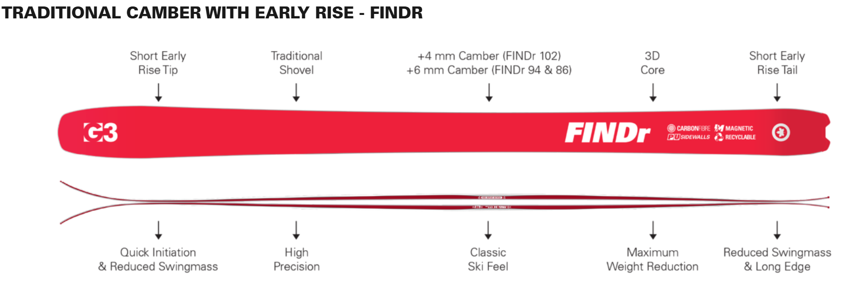 Το βραβευμένο FINDr R3 διαθέτει μαγνητικά σημεία επαφής, που επιταχύνουν τις μεταβάσεις κατά τη μεταφορά και εξαλείφουν την ανάγκη για ιμάντα ώμου. Σχεδιασμένο για εξαιρετική απόδοση στο ορειβατικό σκι, σε σκληρές και μεικτές συνθήκες χιονιού, καθώς και για μέγιστο έλεγχο στις ακμές, το FINDr R3 διαθέτει ένα παραδοσιακό Camber προφίλ. Επιπλέον, η πρώιμη ανύψωση της μύτης προσφέρει επιπλέον άνωση στο βαθύ χιόνι.
