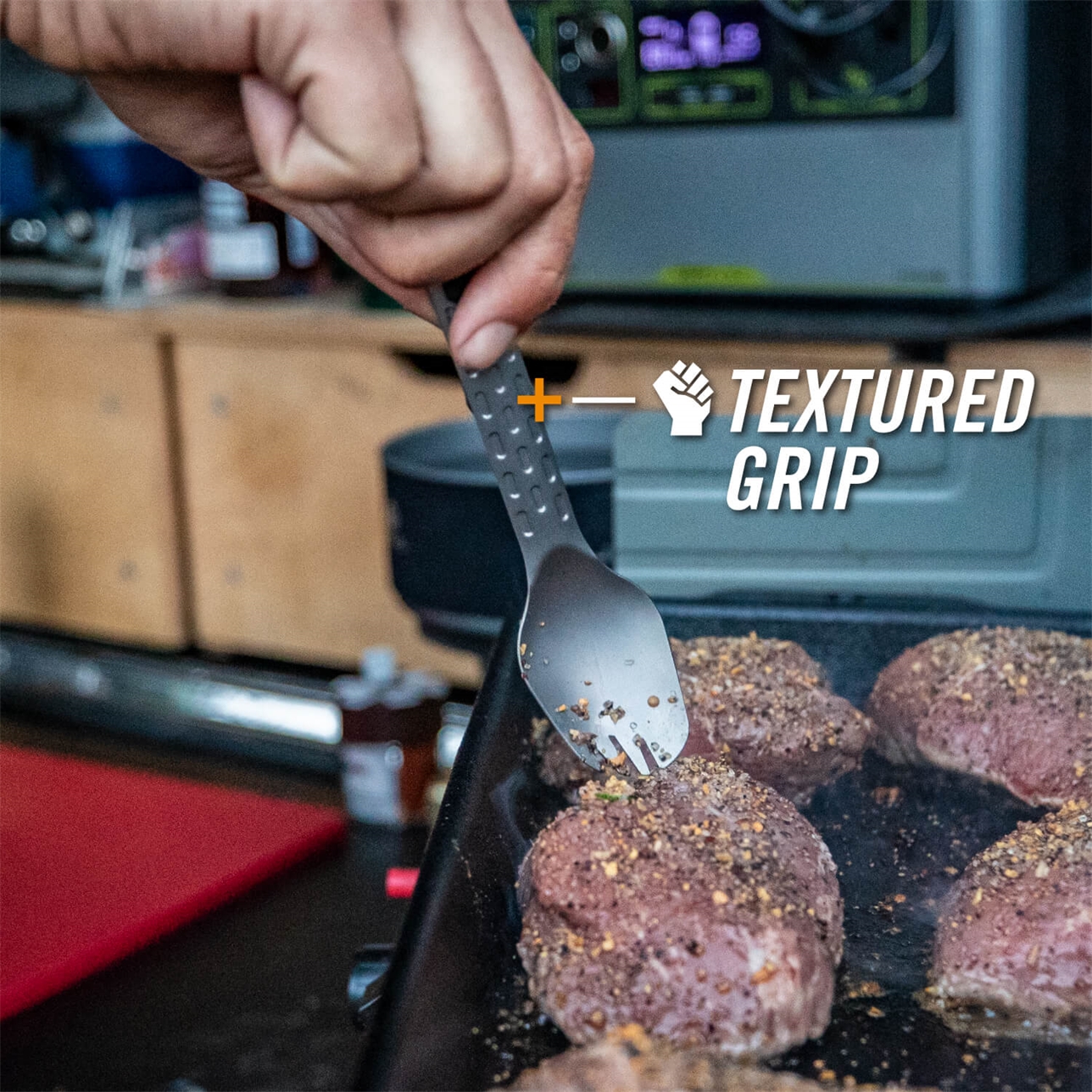 The award-winning Devour gets an upgrade: the Titanium provides a superior weight to strength ratio. With the same great 9 functions, the Devour Titanium is the only tool needed for cooking, eating, and cleaning. It snaps together for secure portability, yet each tool also works independently.
