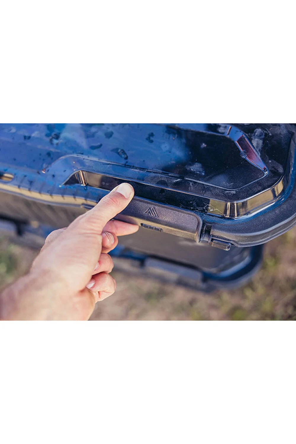 - Top lid designed to channel water and drain off lid