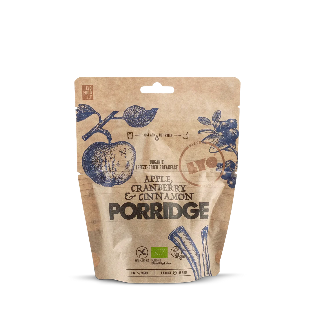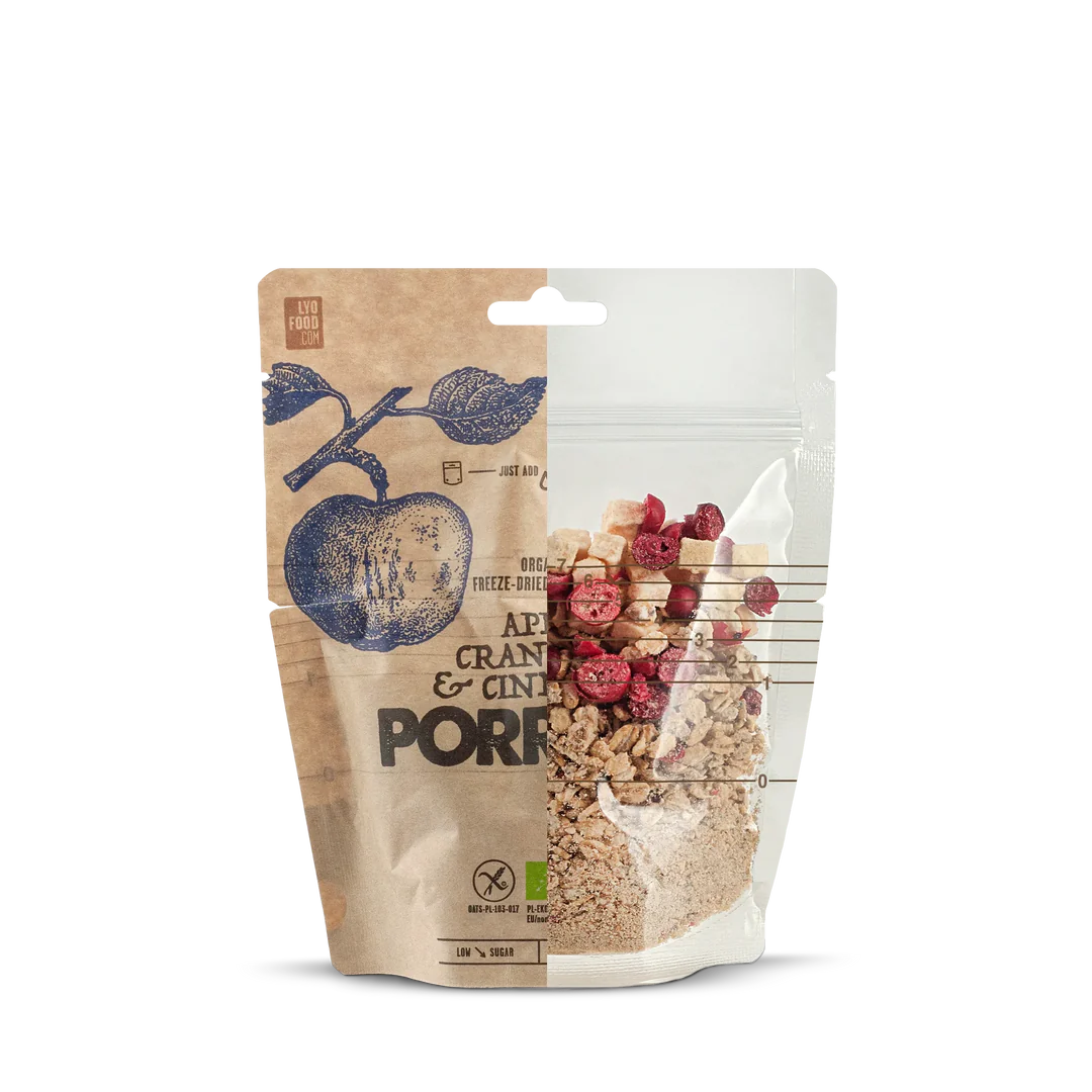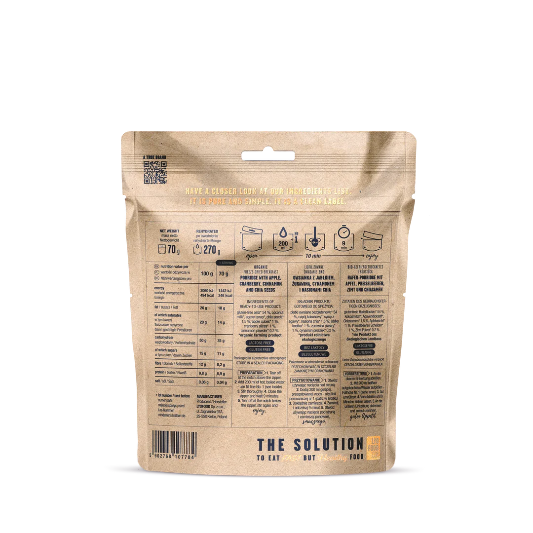 Ingredients of ready-to-use product: gluten-free oats* 54 %, coconut milk*, agave syrup*, chia seeds* 1,5 %, apple cubes* 1 %, cranberry slices* 1 %, cinnamon powder* 0,2 %.