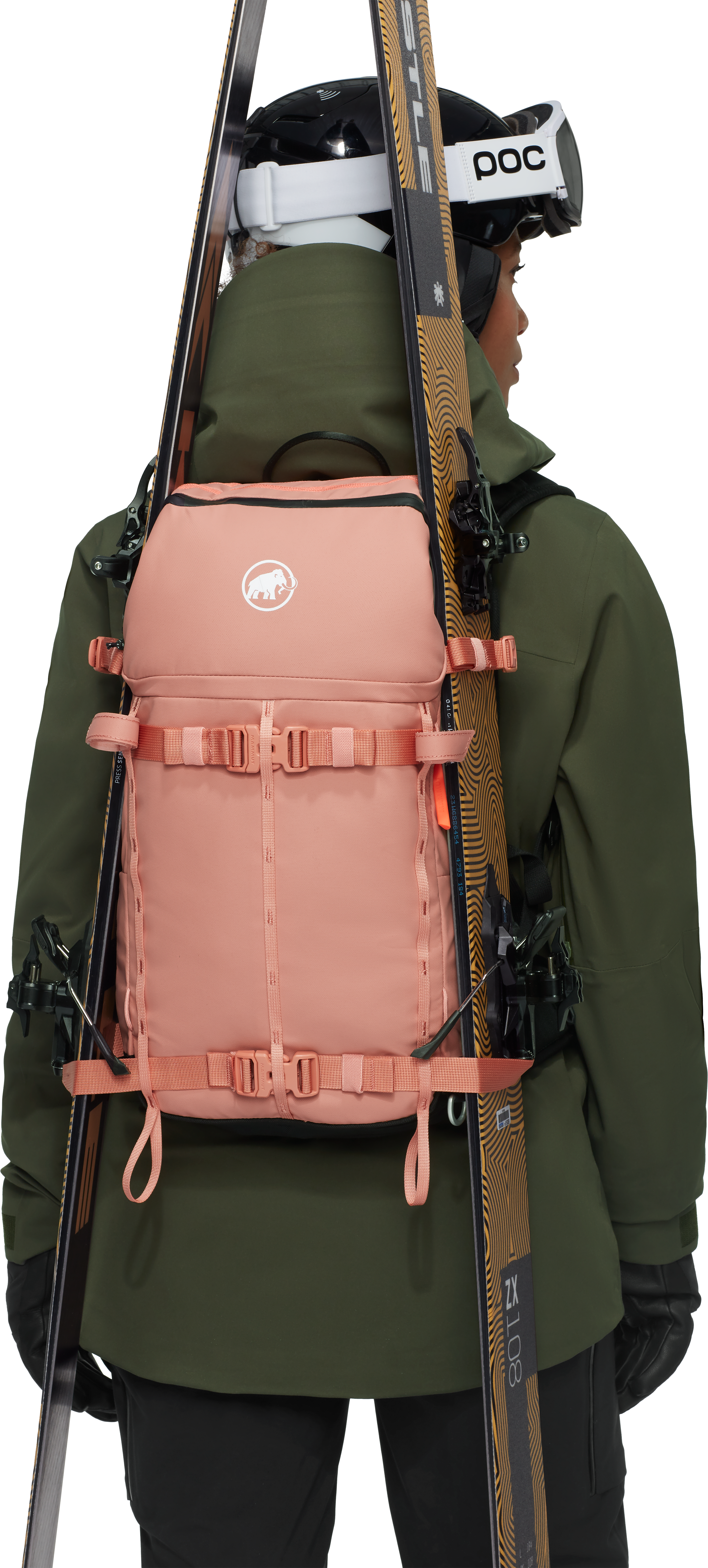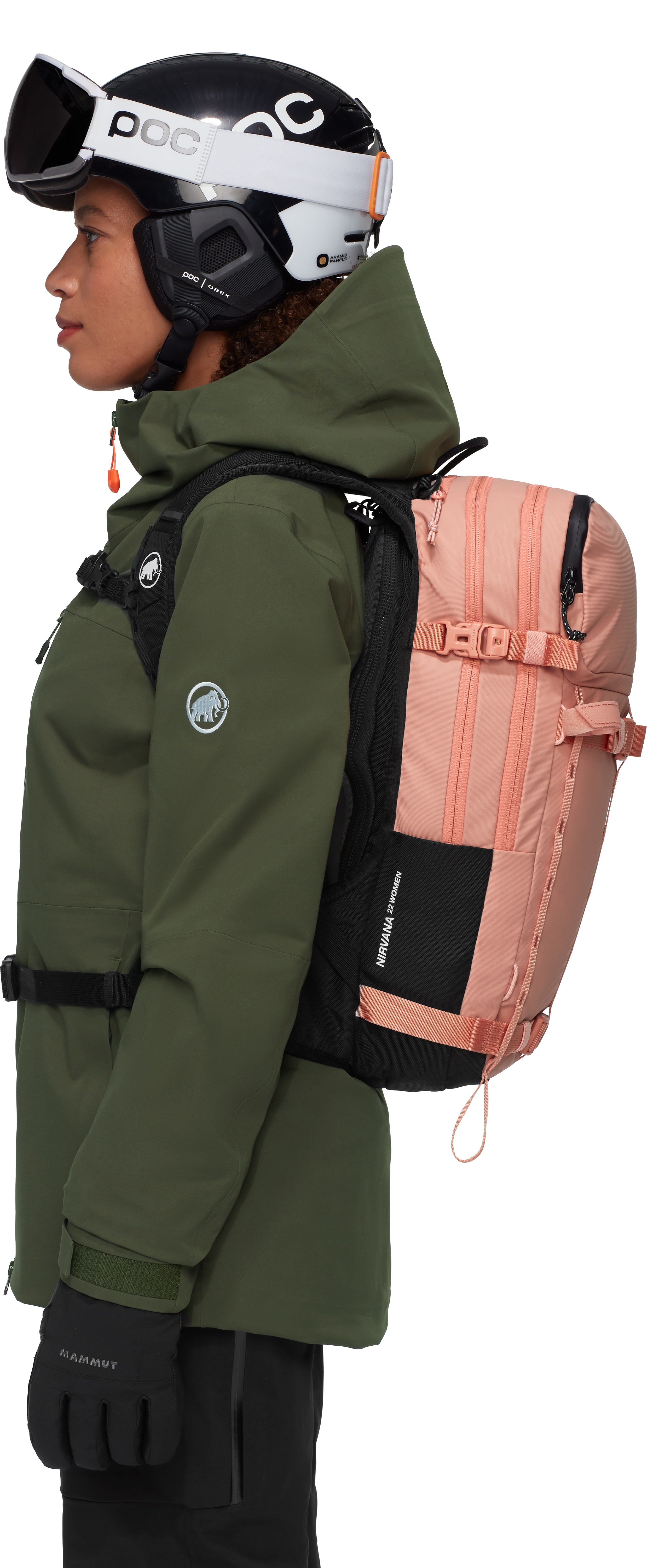 The legendary Nirvana is our true snow sports pack, optimized for freeriding and lift-supported ski touring. Versatile and well-equipped with specialized winter features, the Nirvana 22 is the ideal partner for a wide range of plans. Organize and stow all your gear with easy access to the main compartment through the 270° zippered back panel. A separate avalanche equipment compartment ensures you are always prepared, while a dedicated internal sleeve makes the pack compatible with the Mammut Back Protector. Skis and splitboards can be attached diagonally or A-frame style. An optimized carrying system and women's fit, features adapted shoulder straps, a tailored hip belt, and a shorter back length for maximum comfort and freedom of movement. The specially selected fabrics, including the extremely robust outer, are PFC-free and made from recycled materials.