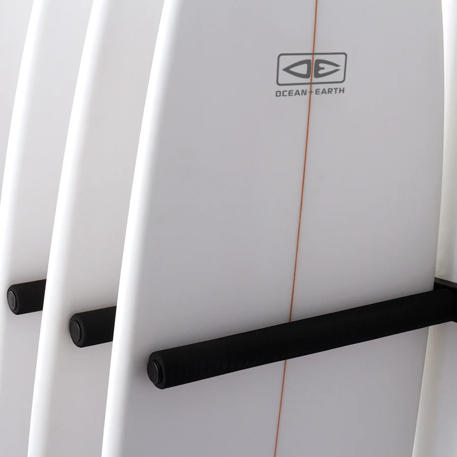 Protect and store your boards with the Surfboard Stack Rack. Featuring a heavy-duty metal frame and 50mm soft protective EVA padded sleeves to protect your sticks. This surfboard rack holds 4 boards and is easily mounted onto the wall with the hardware pack and instructions provided. Comes as one single rack, meaning you can stack 4 boards vertically. Paired with the Eva Padded Floor Mat, you have the perfect storage system for your quiver.