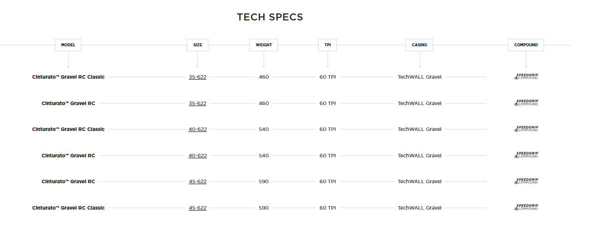 С прогресивен, специфичен дизайн, вдъхновен от емблематичната Scorpion XC RC, Cinturato Gravel RC е отговорът на всички изисквания на гравел състезанията: бърза в правите отсечки, благодарение на ниския централен грайфер, и агресивна в завоите – с по-високи и по-масивни буци за по-добро управление при завиване. Снабдена е с безкамерна конструкция TechWALL, включваща подсилена и устойчива на порязване 60 TPI тъкан, както и защитен слой от борд до борд.